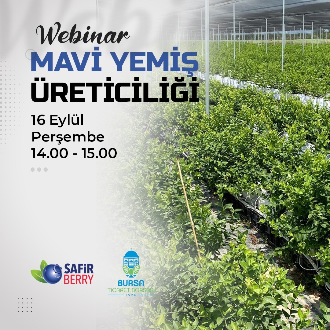 Gelin 16 Eylül Perşembe günü saat 14.00`da son yılların yükselen trendi, sağlık deposu, üreticisi ve yatırımcısı için küresel rekabette ciddi avantaj sağlayan "Mavi Yemiş" fırsatlarını, ihracat ve üretim potansiyelini, ülke ekonomisine katkılarını konuşacağımız webinarımızda hep birlikte buluşalım.