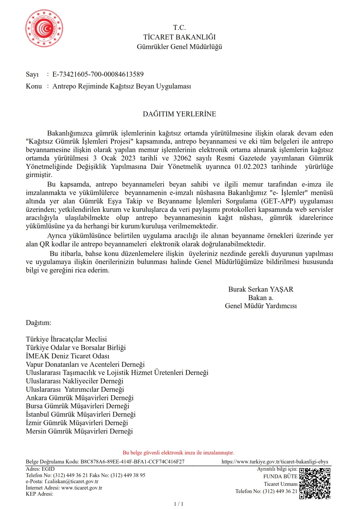 Ticaret Bakanlığı’ndan alınan ve ekte bir örneği sunulan yazıya atfen, Ticaret Bakanlığı’nın “Kağıtsız Gümrük İşlemleri Projesi” kapsamında antrepo beyannamesi ve eki tüm belgeleri ile antrepo beyannamesine ilişkin olarak yapılan memur işlemlerinin elektronik ortamda yürütülmesini düzenleyen ilgili mevzuat kapsamında, antrepo beyannamelerinin imza ve doğrulama işlemlerine dair bilgi verilmektedir.