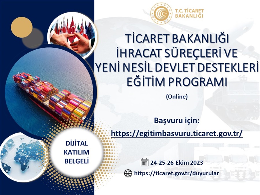 Ticaret Bakanlığı’nın ilgili yazısına atfen, 24-25-26 Ekim 2023 tarihlerinde Ticaret Bakanlığı tarafından “İhracat Süreçleri ve Yeni Nesil Devlet Destekleri Eğitim Programı”nın 1000 kişilik kontenjan sınırı ile çevrimiçi olarak gerçekleştirileceği açıklanmış olup, programa katılmak isteyenlerin 20 Ekim 2023 Cuma günü saat 12:00’ye kadar https://egitimbasvuru.ticaret.gov.tr linki üzerinden yaptırılabileceği bildirilmiştir.