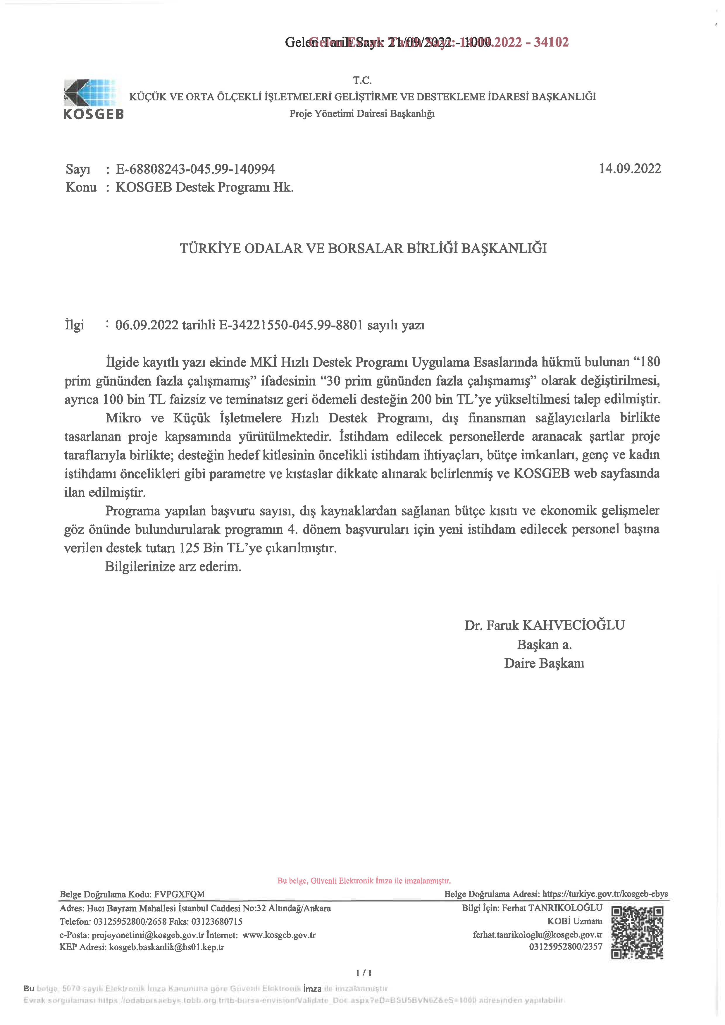 KOSGEB tarafından TOBB’a iletilen 14.09.2022 tarih ve 140994 sayılı Mikro ve Küçük İşletmelere Hızlı Destek Programı konulu yazı ekte yer almakta olup; KOSGEB’e gelen talepler doğrultusunda, programa yapılan başvuru sayısı, dış kaynaklardan sağlanan bütçe kısıtı ve ekonomik gelişmeler göz önünde bulundurularak programın 4. dönem başvuruları için yeni istihdam edilecek personel başına verilen destek tutarı 100 Bin TL’den 125 Bin TL’ye çıkarılmıştır.