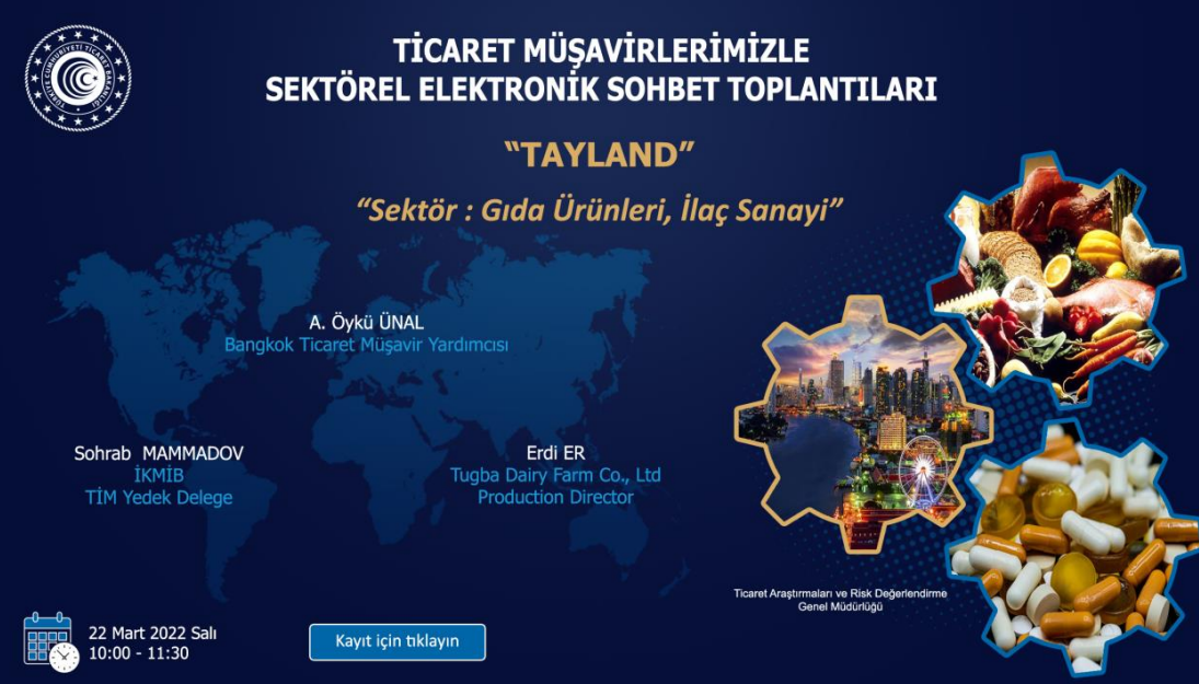 Ticaret Bakanlığı’ndan alınan ilgili yazıya istinaden, 22 Mart 2022 Salı günü 10:00-11:30 saatleri arasında Tayland’da görev yapmakta olan Ticaret Bakanlığı temsilcisi moderatörlüğünde, gıda ürünleri ve ilaç sanayi sektörlerinde Tayland’da iş yapmakta olan firma temsilcimiz ile ilgili İhracatçı Birliği yönetim kurulunda görev alan iş insanımızın konuşmacı olarak katılacağı “Tayland: Gıda Ürünleri, İlaç Sanayi” isimli sektörel e-sohbet toplantısının gerçekleştirileceği bildirilmektedir.