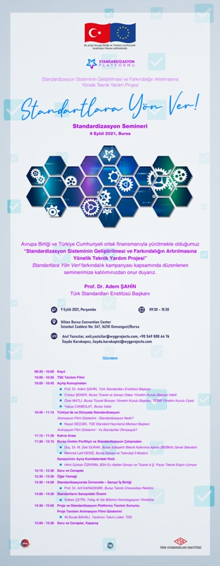 Standardizasyon Platformu tarafından Avrupa Birliği ve Türkiye ortak finansmanıyla yürütülmekte olan “Standardizasyon Sisteminin Geliştirilmesi ve Farkındalığın Artırılmasına Yönelik Teknik Yardım Projesi” Standartlara Yön Ver! farkındalık kampanyası kapsamında 9 Eylül Perşembe günü saat 09:30’da Hilton Bursa Convention Center’da seminer düzenlenecektir.
