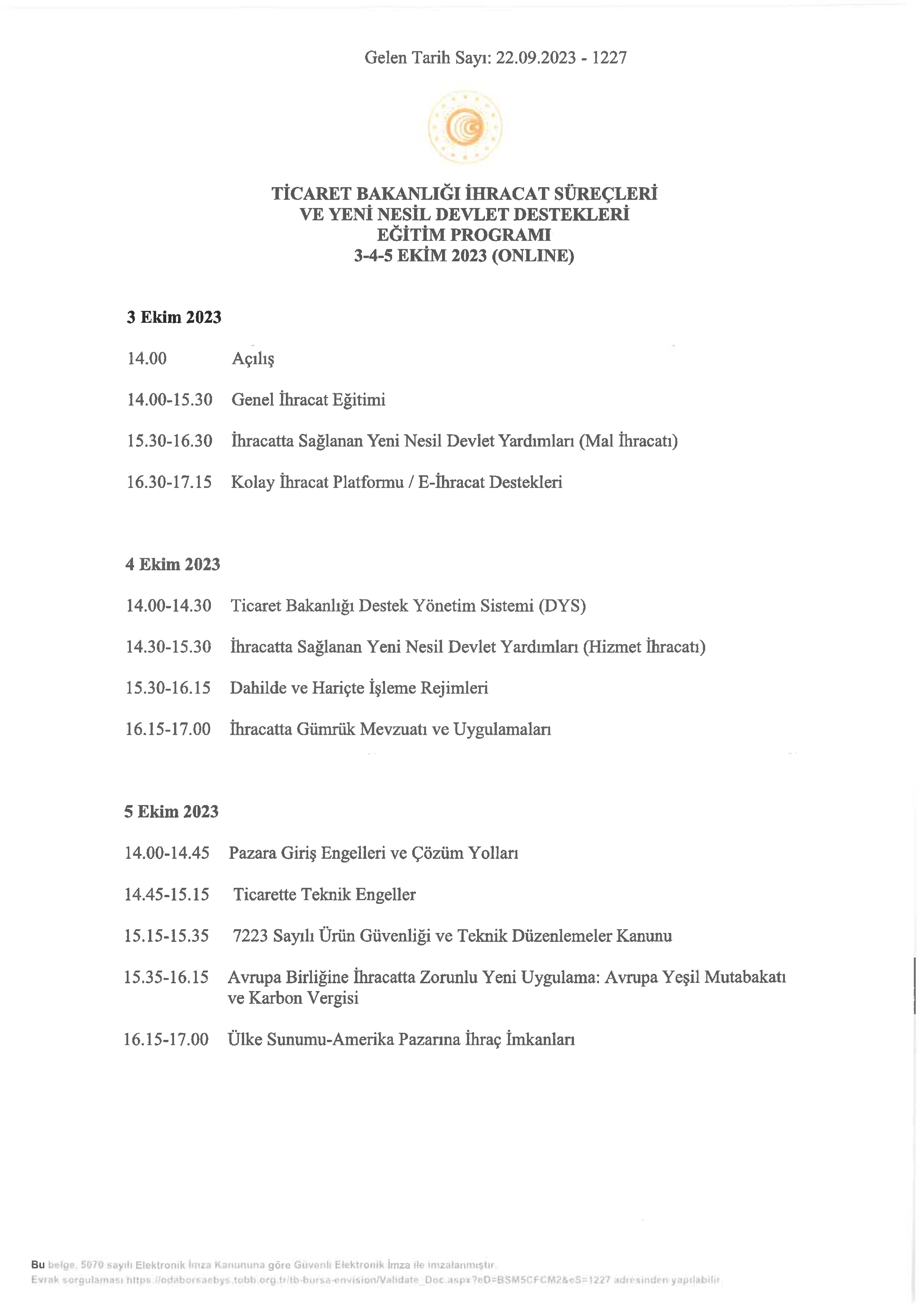 Ticaret Bakanlığı’ndan alınan yazıya atfen, 3-4-5 Ekim 2023 tarihlerinde Ticaret Bakanlığı tarafından “İhracat Süreçleri ve Yeni Nesil Devlet Destekleri Eğitim Programı”nın 1000 kişilik kontenjan sınırı ile çevrimiçi olarak gerçekleştirileceği açıklanmış olup, programa katılmak isteyenlerin 29 Eylül 2023 tarihi saat 12:00’ye kadar https://egitimbasvuru.ticaret.gov.tr linki üzerinden kayıt yaptırabileceği bildirilmiştir.