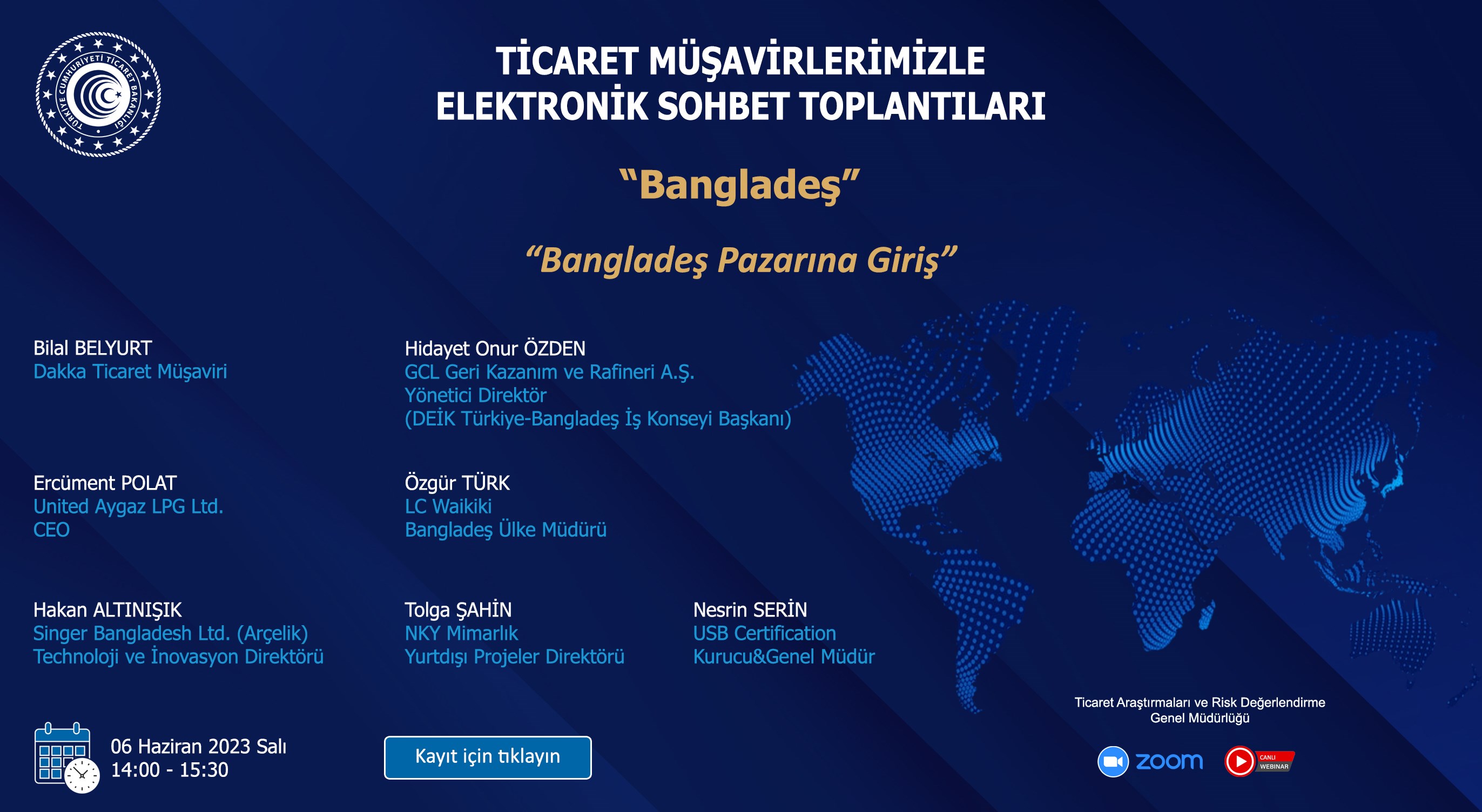 Ticaret Bakanlığı’nın ilgili yazısına atfen; 06 Haziran 2023 Salı günü saat 14:00’da Bangladeş’te görev yapmakta olan Ticaret Müşaviri ile “Bangladeş Pazarına Giriş” e-sohbet toplantısı gerçekleştirileceği bildirilmektedir.Toplantıya ilişkin kayıt https://bit.ly/3N0mYWt adresinden yapılmaktadır.
