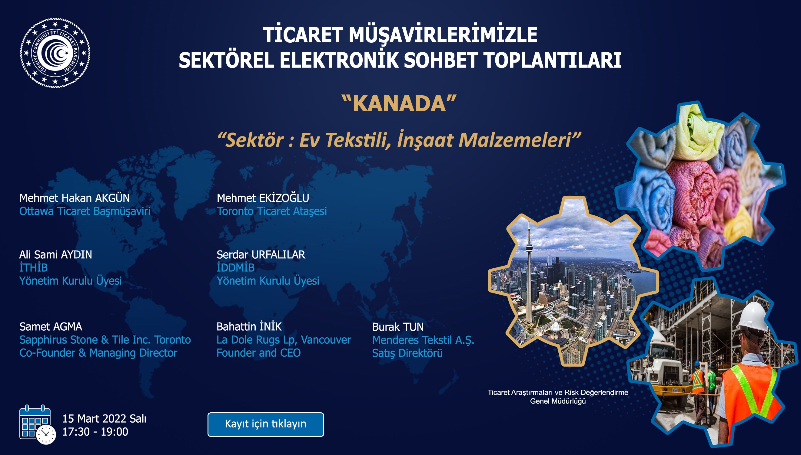 Ticaret Bakanlığı’na bağlı olarak dünyanın dört bir yanında ihracatımızın geliştirilmesi için çalışmakta olan Ticaret Müşavir ve Ataşelerimiz ile Türk iş dünyasını bir araya getirmek üzere "Ticaret Müşavirlerimizle Elektronik Sohbetler" toplantılarının düzenlendiği, bu çerçevede 15 Mart 2022 Salı günü saat 17:30’da Kanada’da görev yapmakta olan Ticaret Müşavirimiz ve Ataşelerimiz ile bu ülkede iş yapmakta olan iş insanlarımızın, “Ev Tekstili ve İnşaat Malzemeleri” sektörlerine yönelik, konuşmacı olarak katılarak tecrübelerini paylaşacağı e-sohbet toplantısının gerçekleştirileceği bildirilmektedir.