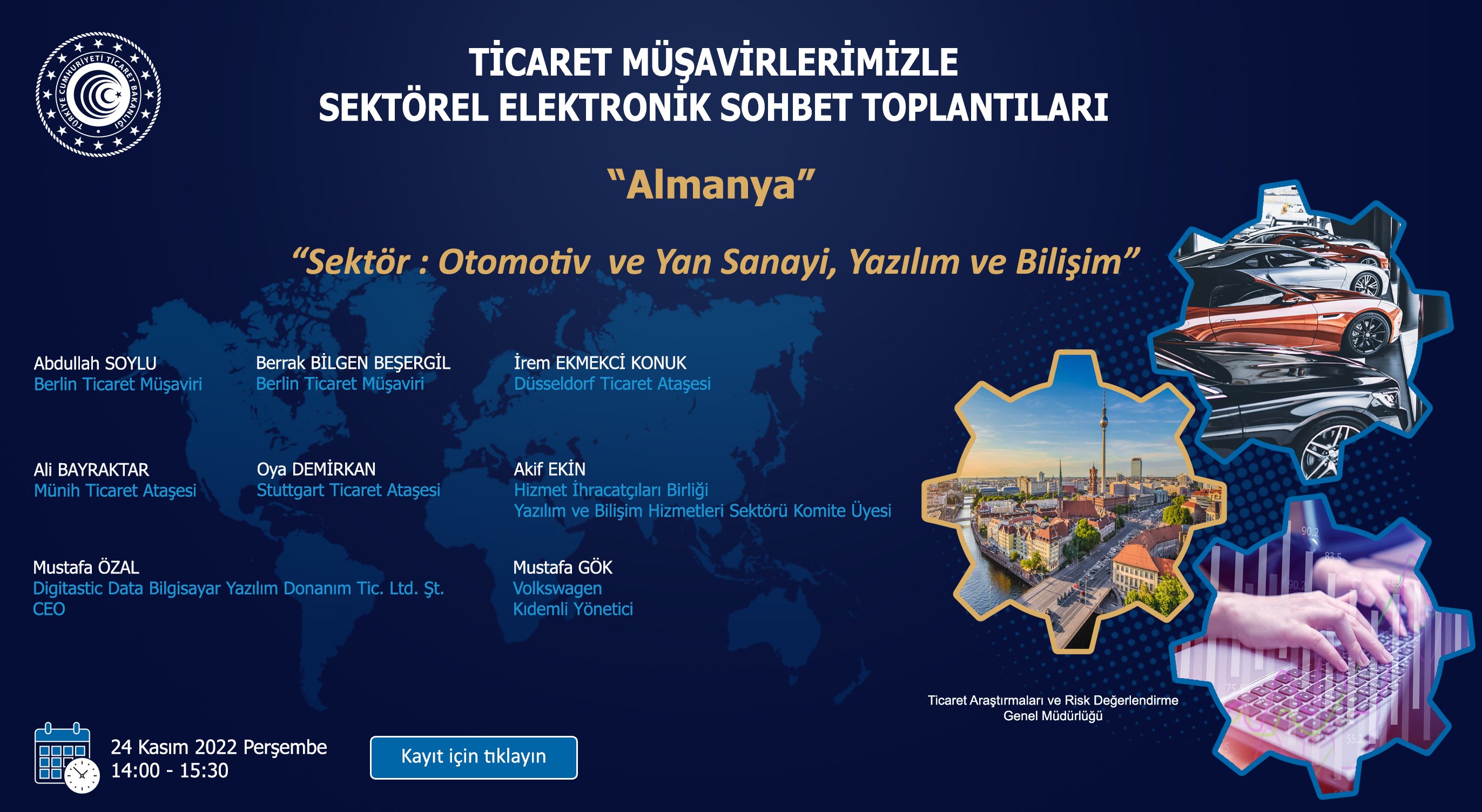 Bu kapsamda, 24 Kasım 2022 Perşembe günü saat 14:00’da, Almanya’da görev yapmakta olan Ticaret Müşavir ve Ataşelerimizle “Otomotiv ve Yan Sanayi ile Yazılım ve Bilişim” sektörlerine yönelik e-sohbet toplantısı gerçekleştirileceği bildirilmektedir.