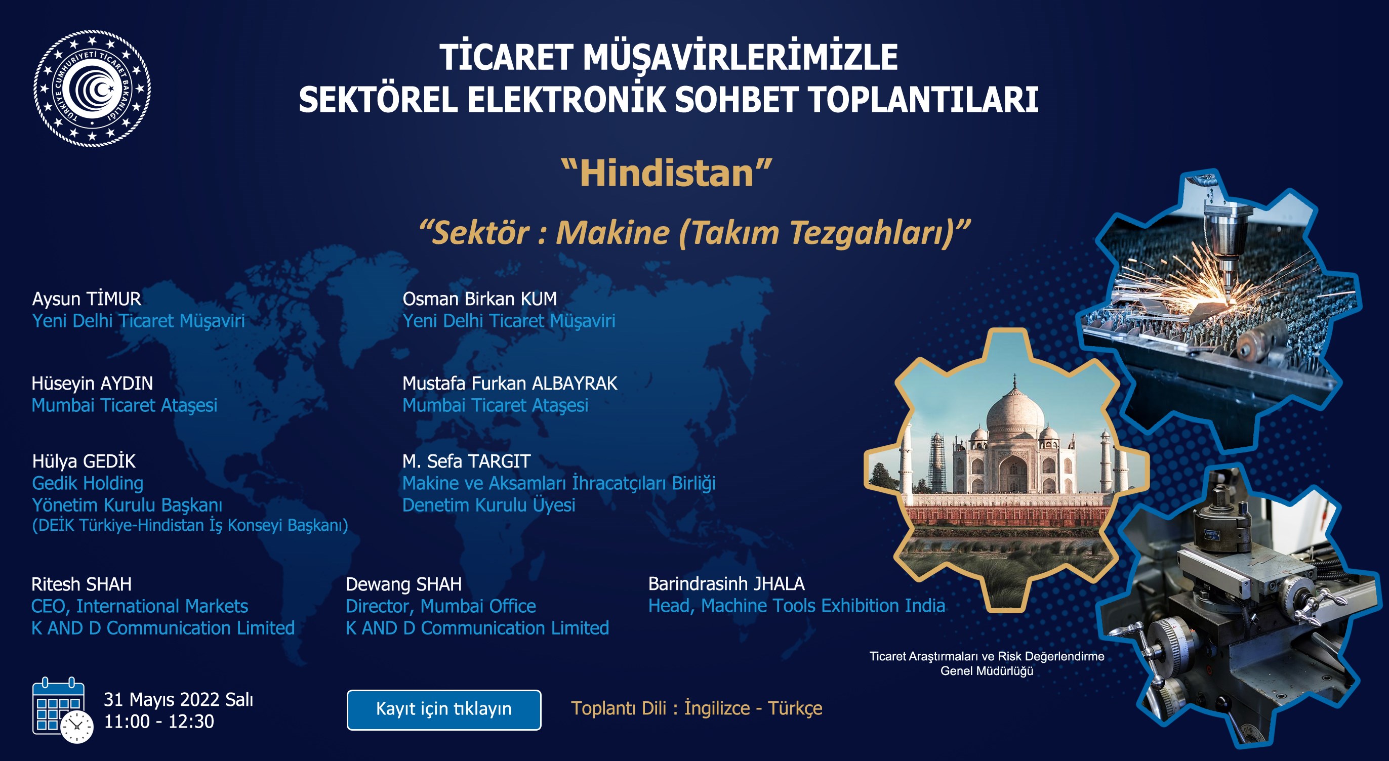 Ticaret Bakanlığı’ndan alınan yazıya atfen, 31 Mayıs 2022 Salı günü saat 11:00’da Hindistan’da görev yapmakta olan Ticaret Bakanlığı temsilcileri ve Hindistan’da iş yapmakta olan iş insanlarımız ile Hintli firma temsilcilerinin konuşmacı olarak katılacağı “Hindistan: Makine (Takım Tezgahları)” isimli sektörel e-sohbet toplantısının gerçekleştirileceği bildirilmektedir.