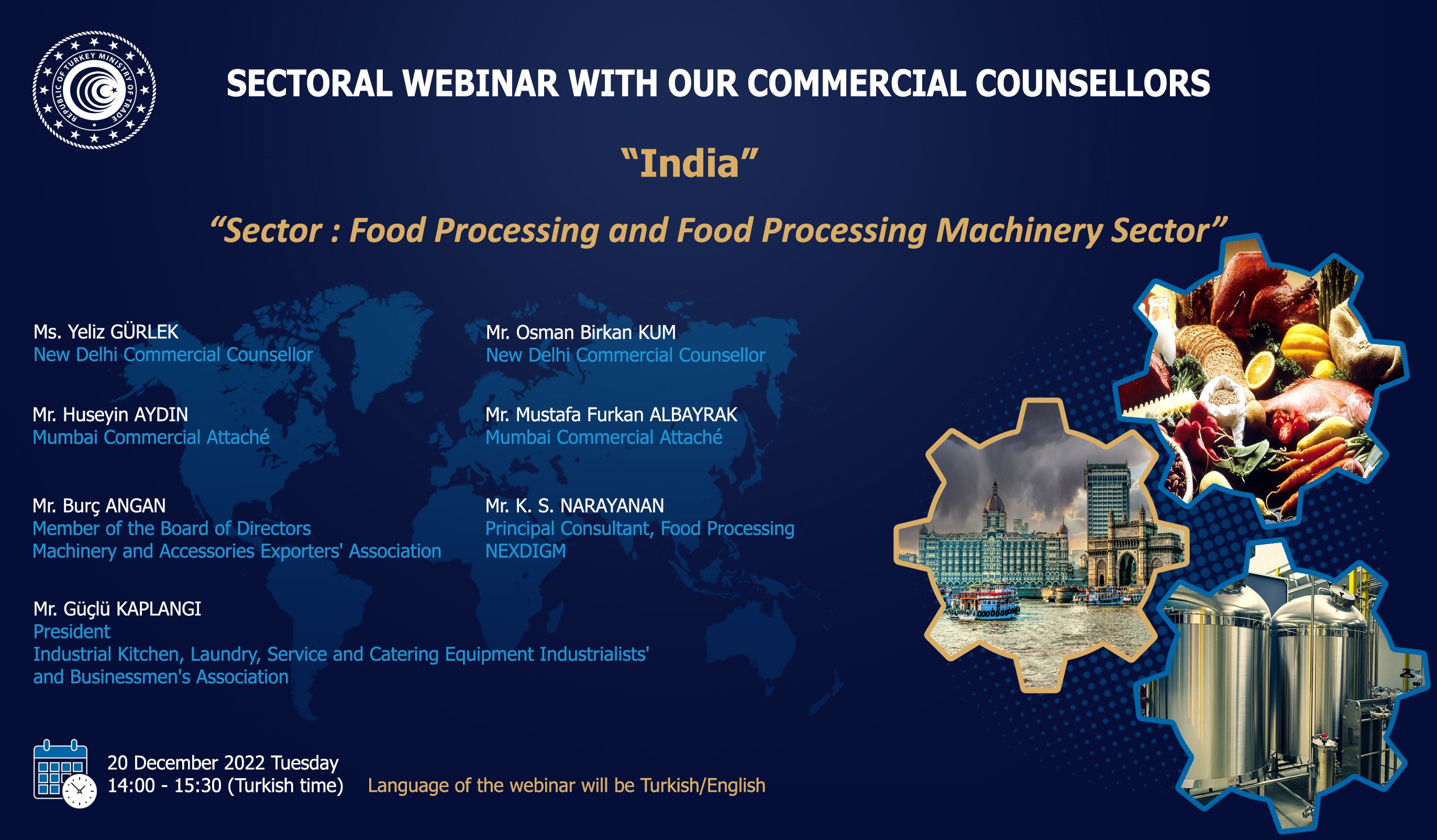Ticaret Bakanlığı’ndan gönderilen yazıya atfen, Ticaret Müşavir ve Ataşelerimizle Türk iş dünyasını bir araya getirmek üzere Ticaret Bakanlığı tarafından “Ticaret Müşavirlerimizle Elektronik Sohbetler” toplantıları düzenlendiği iletilmiştir.Bu kapsamda, 20 Aralık 2022 Salı günü 14:00-15:30 saatleri arasında, Hindistan’da görev yapmakta olan Ticaret Bakanlığı temsilcileri ve Hindistan’da iş yapmakta olan firma temsilcilerinin konuşmacı olarak katılacağı “Hindistan: Gıda İşleme ve Gıda İşleme Makineleri Sektörü’’ isimli sektörel e-sohbet toplantısının gerçekleştirileceği bildirilmektedir.