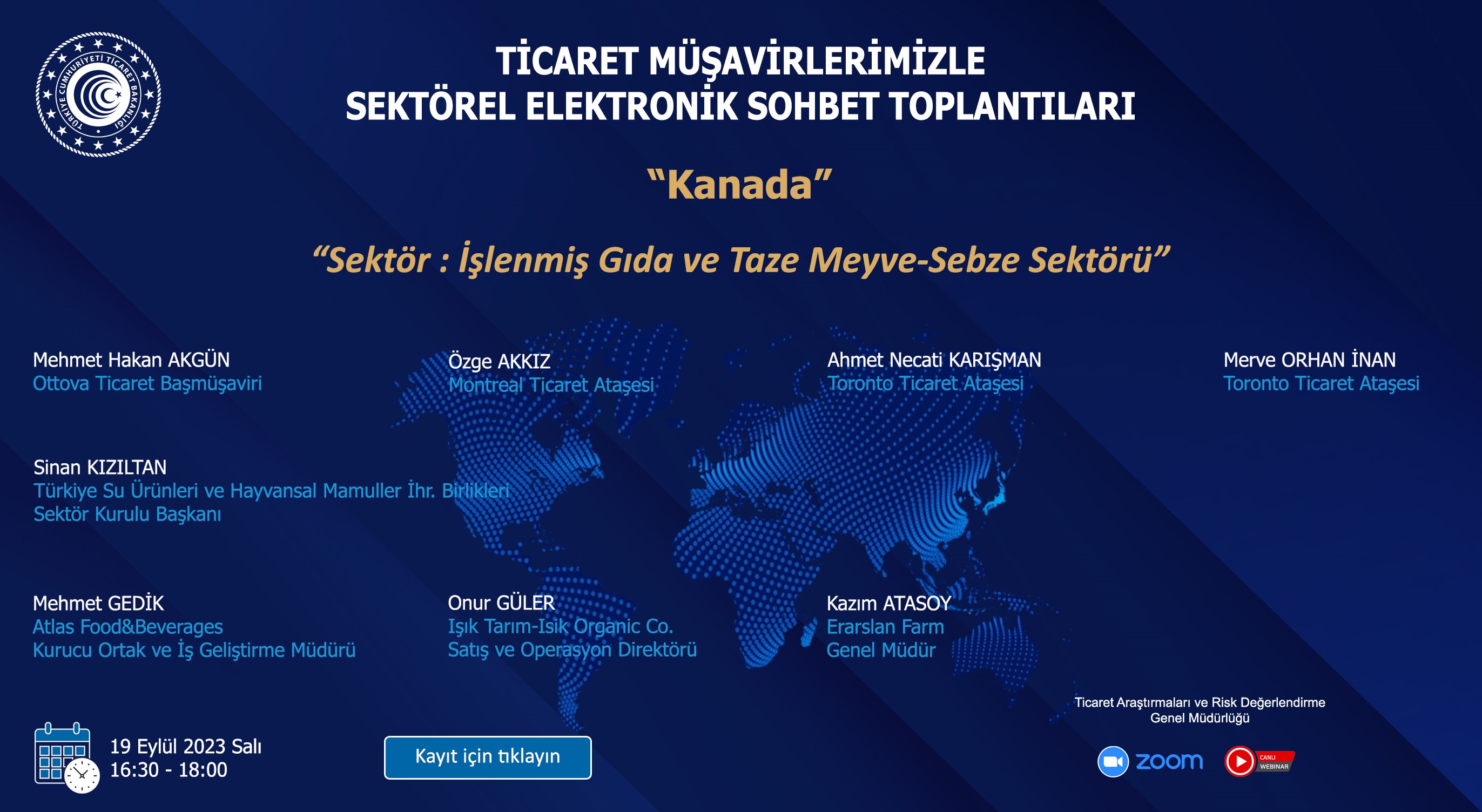 Ticaret Bakanlığı'nın yazısına atfen; Ticaret Bakanlığı tarafınca düzenlenmekte olan “Ticaret Müşavirlerimizle Sektörel Elektronik Sohbetler-Kanada: İşlenmiş Gıda ve Taze Meyve-Sebze Sektörü” e-sohbet etkinliğinin 19 Eylül 2023 Salı günü 16:30-18:00 saatleri arasında “Zoom” uygulaması üzerinden gerçekleştirileceği belirtilmektedir.