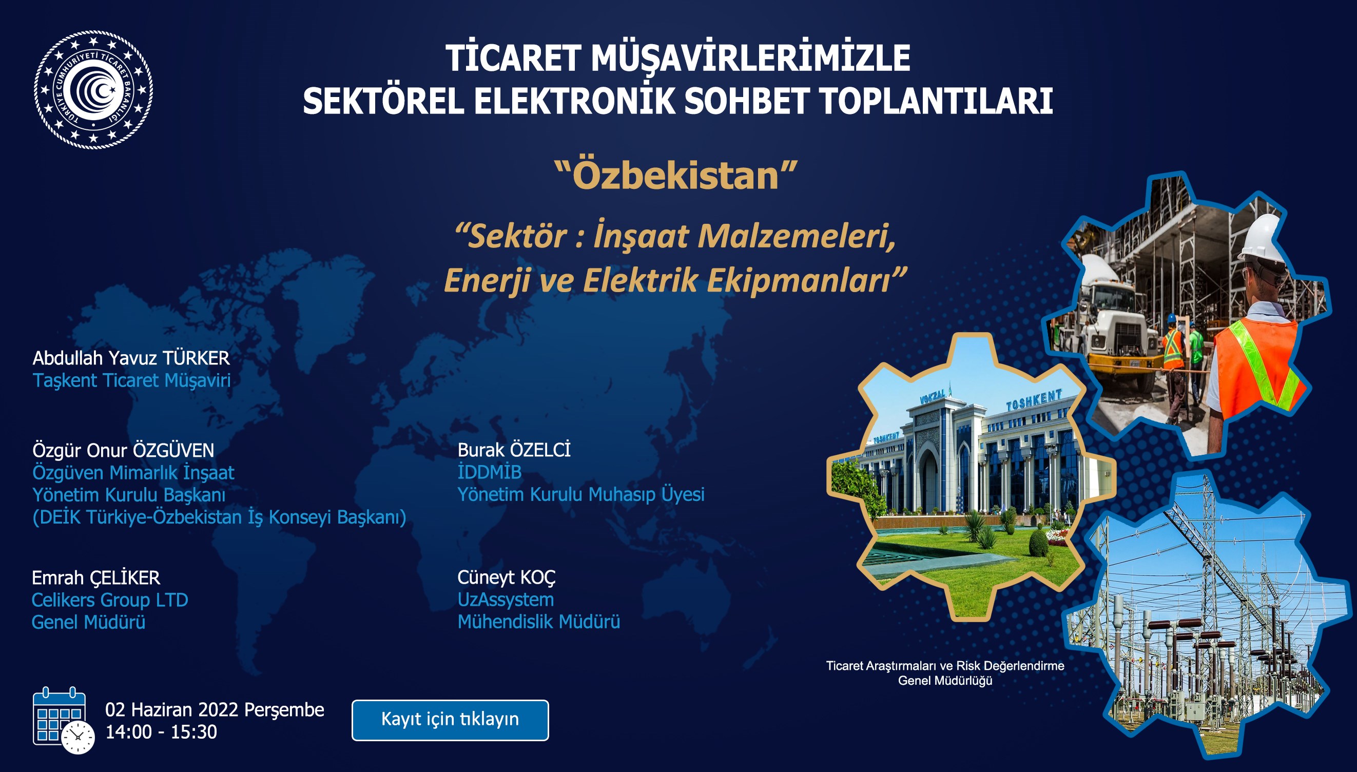 Ticaret Bakanlığı’ndan alınan yazıya atfen, 02 Haziran 2022 Perşembe günü (Bugün) saat 14:00’da Özbekistan’da görev yapmakta olan Ticaret Müşavirimiz ile “İnşaat Malzemeleri, Enerji ve Elektrik Ekipmanları” isimli sektörel e-sohbet toplantısının gerçekleştirileceği bildirilmektedir.
