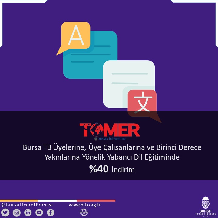 Borsamız ile Ankara Üniversitesi TÖMER Bursa Şubesi arasında eğitim iş birliği protokolü imzalanmıştır.Protokol kapsamında siz değerli üyelerimize, birinci derece yakınlarınıza ve çalışanlarınıza yönelik yabancı dil eğitiminde %40 oranında indirim uygulanacaktır.
