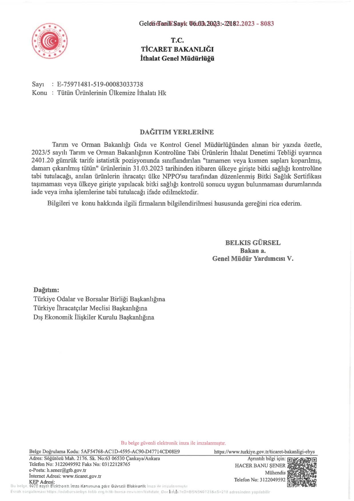 Ticaret Bakanlığı’ndan alınan yazıya atfen, 2401.20 gümrük tarife istatistik pozisyonunda sınıflandırılan “tamamen veya kısmen sapları koparılmış, damarı çıkarılmış tütün” ürünlerinin, 31.03.2023 tarihinden itibaren ülkeye girişinde Bitki Sağlık Sertifikası taşımaması veya bitki sağlığı kontrolü sonucunda uygun bulunmaması durumlarında iade veya imha işlemlerine tabi tutulacağı belirtilmiştir.