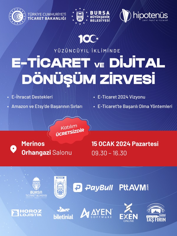 Bursa Büyükşehir Belediyesi katkıları, Borsamızın destekleriyle 15 Ocak 2024 Pazartesi günü 09:30-16:30 saatleri arasında “Yüzüncüyıl İkliminde E-Ticaret ve Dijital Dönüşüm Zirvesi” gerçekleştirilecektir.