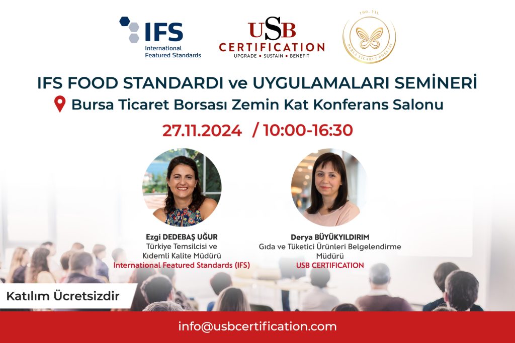 Bursa Ticaret Borsası olarak IFS (International Featured Standards) ve USB Certification iş birliğiyle, 27 Kasım 2024 tarihinde düzenleyeceğimiz IFS Food v8 Standardı ve Uygulamaları Semineri'ne sizleri davet etmekten mutluluk duyuyoruz.