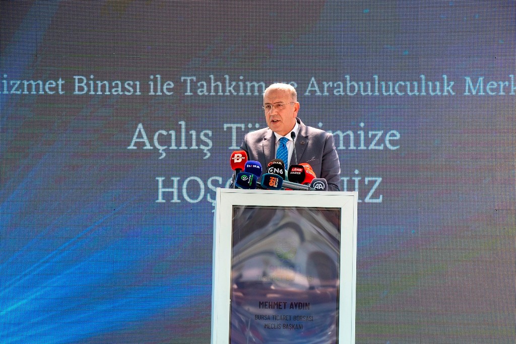 Bursa TB Meclis Başkanı Mehmet Aydın, yeni hizmet binasının Borsa’nın vizyoner kimliğini temsil ettiğini söyledi. Bursa Ticaret Borsası’nın kentin en önemli dinamiklerinden biri olduğunu vurgulayan Başkan Aydın, “Bugün gelinen noktada tescil işlem hacmimiz 10 milyar lira düzeyine gelirken, hem üyelerimizin ticari faaliyetlerine katkı koyan projeler üretiyor, hem kentimizin marka değerini artıracak çalışmalara imza atıyoruz. Yeni hizmet binamız ile birlikte 5 yıldızlı akredite borsa olarak üyelerimize dünya standartlarında hizmet etmeyi sürdüreceğiz. İş, ticari ve tüketici uyuşmazlıklarında Bursa iş dünyasına hizmet edecek tahkim ve arabuluculuk merkezi ile de iş insanlarımızın yaşadıkları uyuşmazlıkları zaman ve itibar kaybı yaşamadan daha kolay şartlarda çözmelerini sağlamış olacağız” dedi.