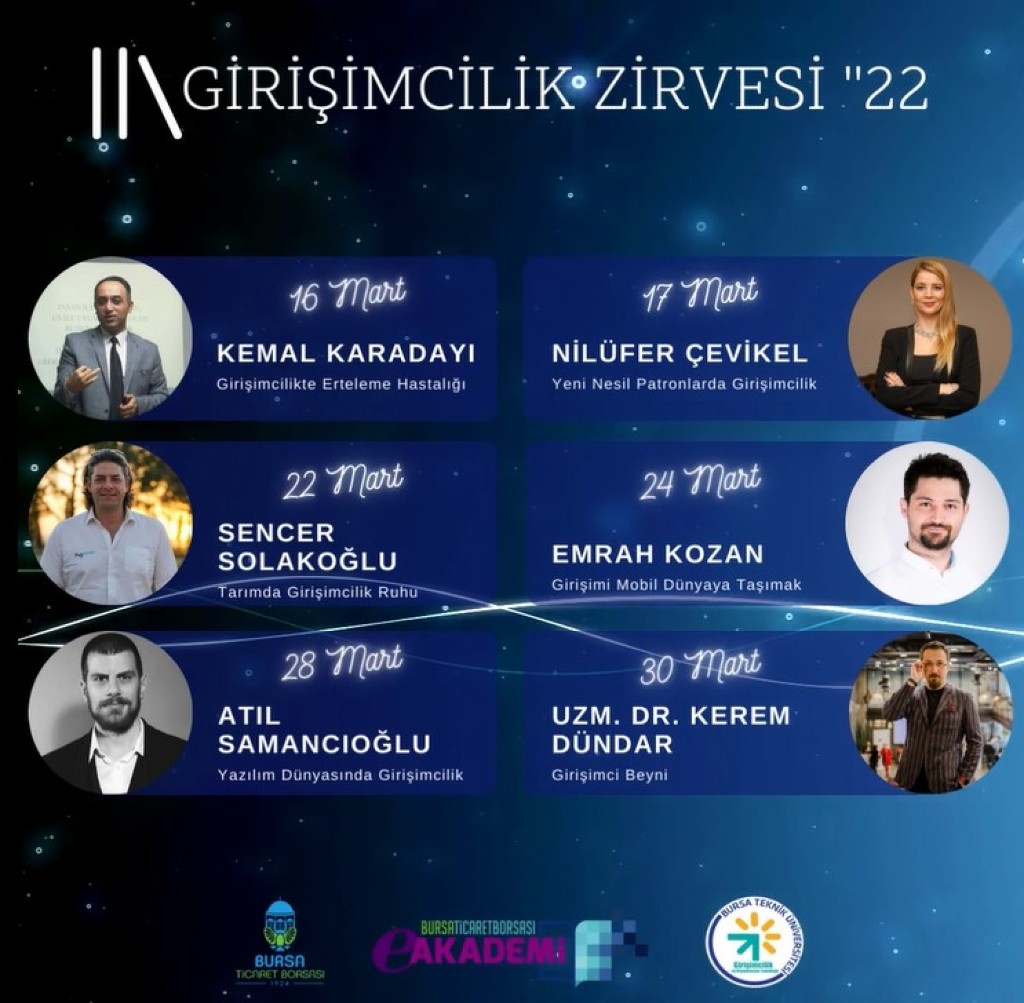 Bursa TB Online Akademi’de 22 Mart Salı günü Feyz Hayvancılık Kurucusu, TÜSEDAD Yönetim Kurulu Başkanı Sencer Solakoğlu ile devam edecek Girişimcilik Zirvesi, 24 Mart Perşembe günü Piksel Akademi Kurucusu ve Eğitmen Emrah Kozan, 28 Mart Pazartesi günü Academy Club&Pera Games Kurucusu Atıl Samancıoğlu, 30 Mart Çarşamba günü London School Of Mind Kurucusu Uzm. Dr. Kerem Dündar’ın katılımlarıyla tamamlanacak.