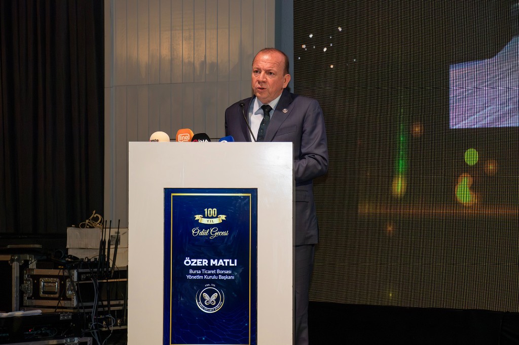 Bursa Ticaret Borsası Yönetim Kurulu Başkanı Özer Matlı yaptığı konuşmada, Bursa TB’nin bir asırlık güçlü tarihine ve modern ticaretin gerekliliklerine uyum sağlama misyonuna dikkat çekti. Matlı, “Bir asır önce Bursa ve Türkiye’nin geleceğine yön vermek üzere temelleri atılan Borsamız, bugün güçlü geçmişi, örnek projeleri ve yenilikçi çalışmalarıyla yalnızca şehrimize değil, ülkemize de değer katmaya devam etmektedir. Bugünkü başarılarımız yalnızca geçmişimizin bir ürünü değil, aynı zamanda geleceğe dair güçlü bir vizyonun yansımasıdır. 2013 yılından bu yana, üye sayımızı yaklaşık yüzde 200 oranında arttırarak, bugün 1250 üyeye yükselttik. Yine bu dönemde işlem hacmimizi, değerli üyelerimizin gücüyle, 1 milyar liradan 40 milyar lirayı aşan bir seviyeye ulaştırarak, ülkemizde ticaret borsaları arasında ilk sıralarda yer alma başarısını gösterdik” ifadelerini kullandı.