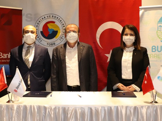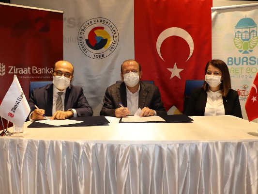 Bursa Ticaret Borsası Doğanbey Sivil Mimari Örneği Hizmet Binası’nda gerçekleştirilen imza törenine Bursa Ticaret Borsası (Bursa TB) Yönetim Kurulu Başkanı ve Türkiye Odalar ve Borsalar Birliği (TOBB) Yönetim Kurulu Üyesi Özer Matlı, Ziraat Bankası adına Bursa Bölge Yöneticisi Nihat Tufan ve Bursa Şube Müdürü Suzan Alıcı katıldı.